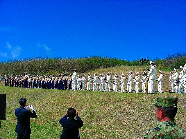 この日は、うれしいことに天気に恵まれたが予想以上に暖かい炎天下となり、その下でずっと整列させられていた彼らは大変だったと思う。米海兵隊の1人が突然、日射病でその場に倒れてしまい、担がれて退出するハプニングがあった。