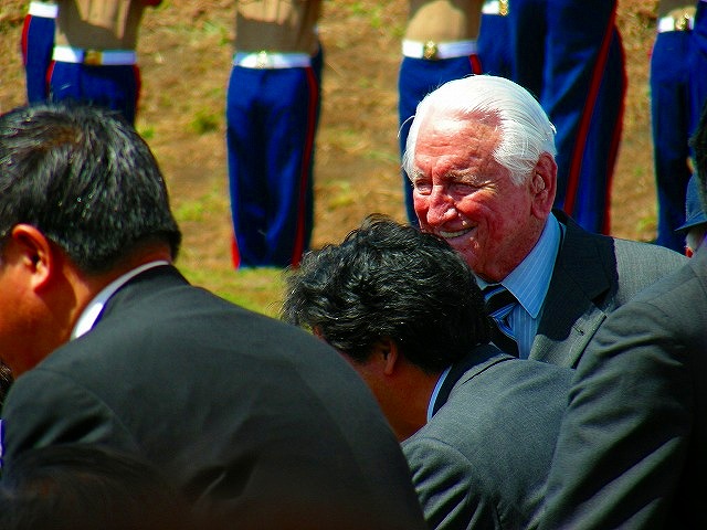 写真奥の白髪の老人は、米硫黄島協会の会長さん。その下のボサボサ頭が、安住氏。