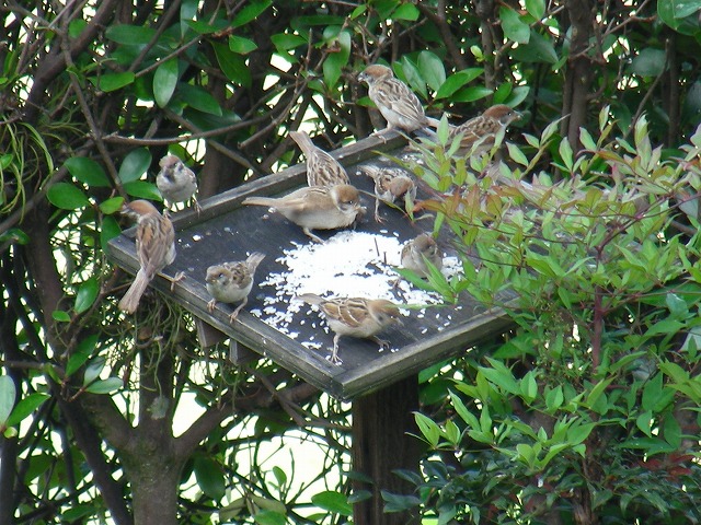 』という結論に即日達した様子。1年強もの間に半分以上を食べた僕は辛抱がいい。それで、実家の庭に備えつけてある餌台にこのタイ米を置いたところ、その日は何物も寄り付かなかったらしいのですが、そのうち写真のスズメ達が日を追うたびに増え、今ではなんと20羽かそれ以上のスズメ達が集まってきます。