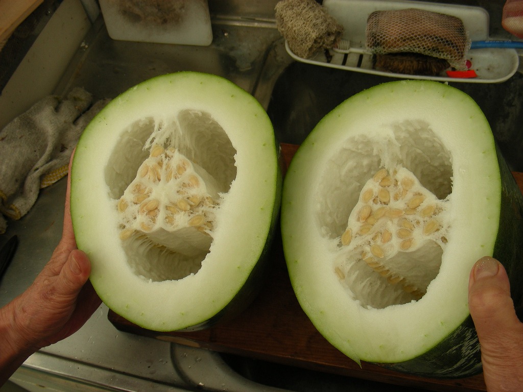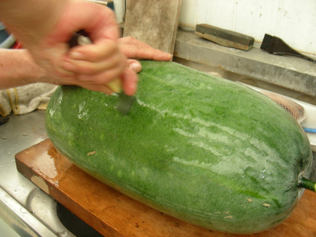 冬瓜は沖縄の夏野菜らしいのですが、収穫したあとも、そのまま冬まで保管が利くことが名前の由来だそうです。茎や葉、そして実は痛いほど鋭い毛で覆われていて、これをタワシでこすり落とすらしいのですが、収穫したものは毛が枯れてツルツルでした。この状態だと熟れすぎらしいです。