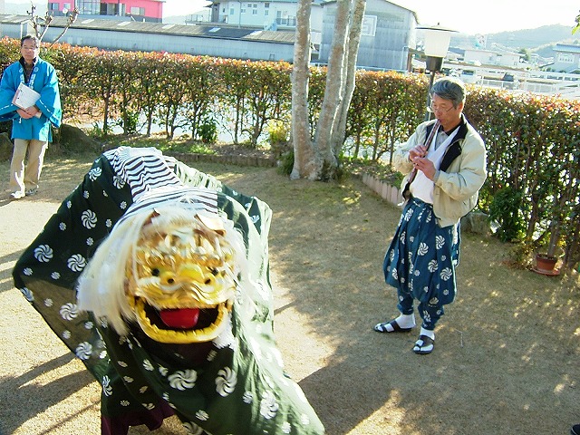 獅子が頭を上げると、布の下から、ジャンバーが見え隠れします。今日は寒い日でした。